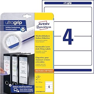 Avery Zweckform L4761REV- Lot de 10 ou 20 feuilles d'étiquettes à classeur amovibles au format A4 soit 40 ou 80 étiquettes, blanc, 61 x 192 mm 40 étiquettes 10 Blatt